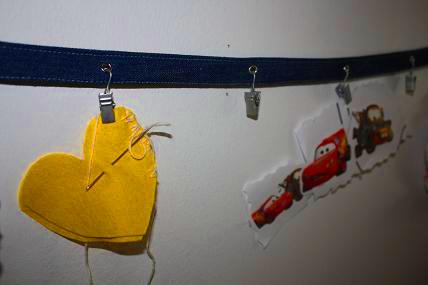 Jättefin! J2 har något liknande att hänga teckningar på i sitt rum. Men jag gjorde latmansvarianten och köpte en färdig vajer med klämmor på IKEA...